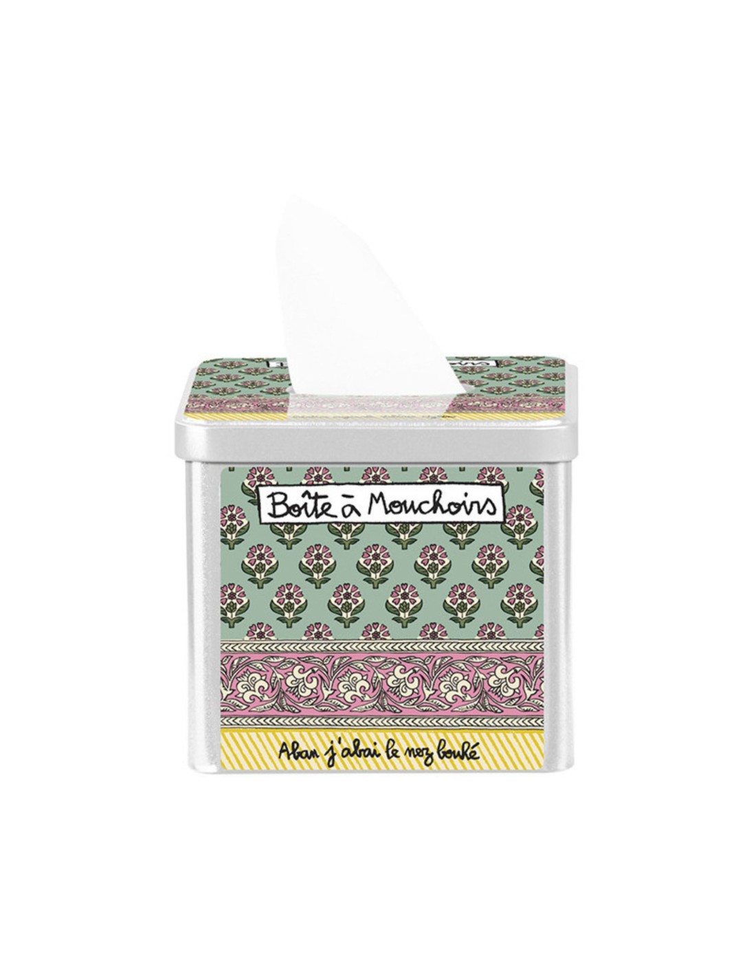 Une boite à mouchoir de forme carrée avec ses motifs colorés.