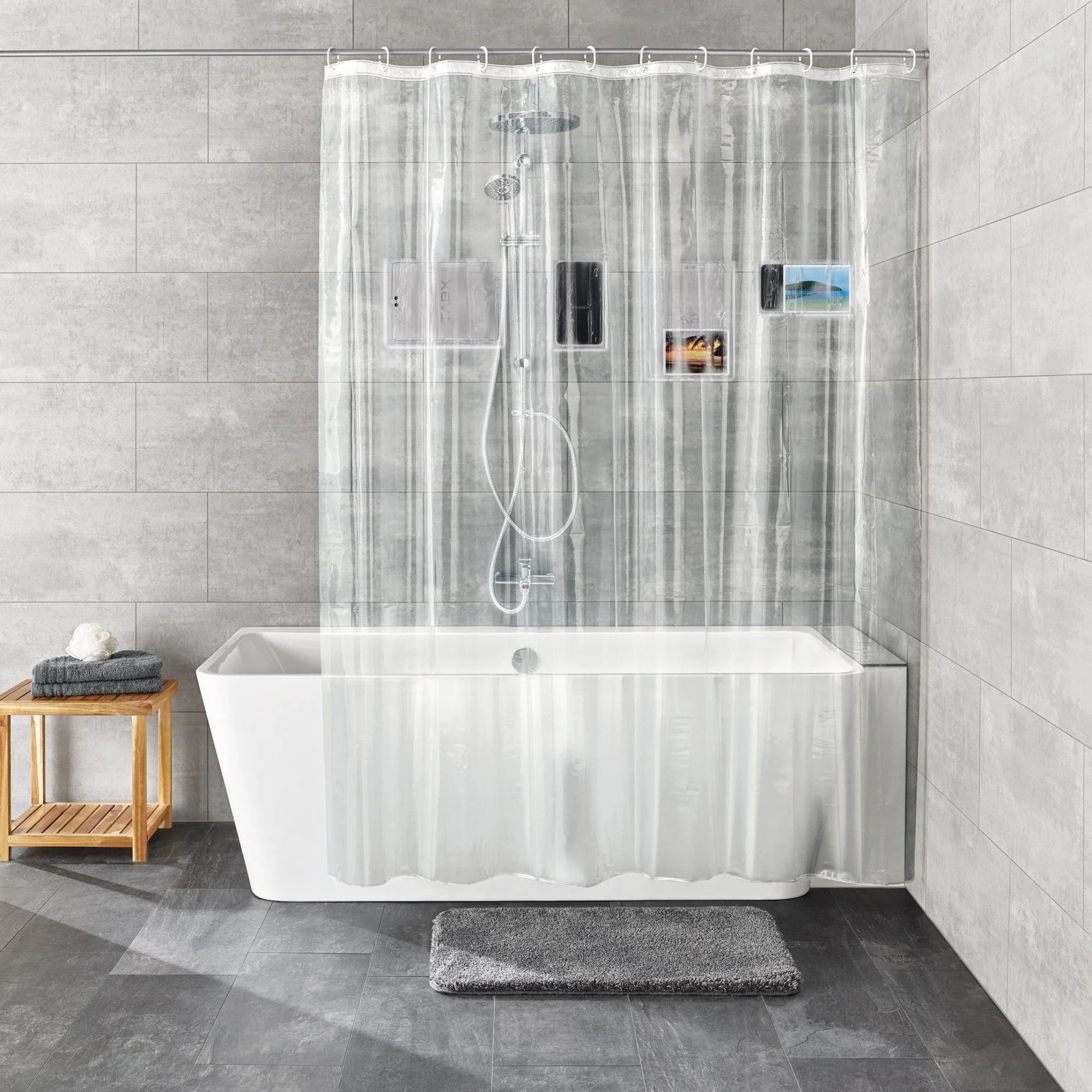 - Rideau de douche à poches ! — parfait pour accessoires légers.