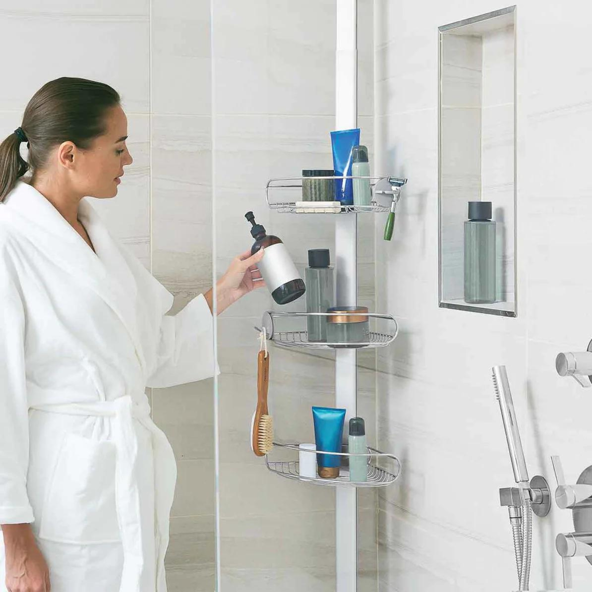 Ces solutions exploitent l’espace vertical de la douche sans fixation permanente. Elles conviennent particulièrement aux douches sans murs solides ou aux locataires qui ne veulent pas percer.